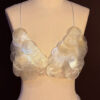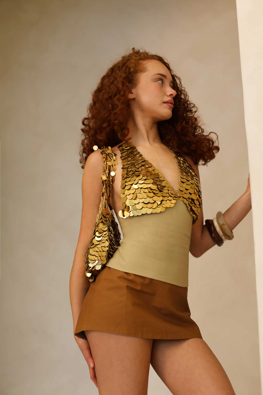 Inspirada nas sereias e nas profundezas do mar, esta elegante bolsinha de ombro é confeccionada em algodão resistente e adornada com miçangas de ouro 18 quilates bordadas à mão.