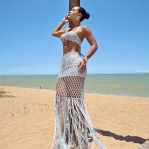 A vibe de “luxo descomplicado” para praia, piscina e viagens está fortíssima. O Conjunto Ibiza traz essa essência: leve, sensual, com transparência calculada e textura natural. Ideal para beach clubs, resorts, sunset parties o Conjunto Ibiza traz consigo o estilo resortwear e estética praiana chic. Nossa dica é combinar o conjunto ao lado de biquinis, brincos de argolas e sandálias rasteiras para finalizar a composição.