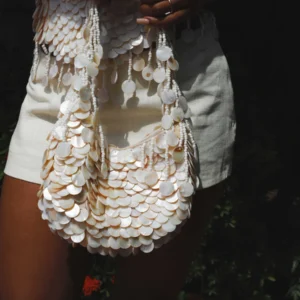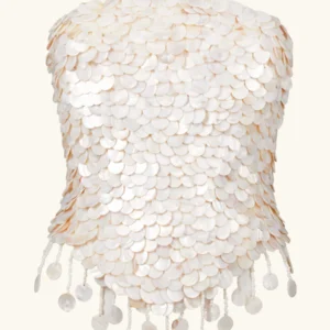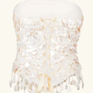 Um corset bandeau com amarração nas costas e detalhes em madrepérola. Criado de forma ética e sustentável em Londres por uma pequena equipe de mulheres. Este top tem um corte que valoriza a silhueta, é feito de algodão macio e finalizado com mais de 1500 pérolas.