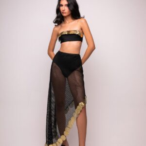 Top sem alças com fecho de metal nas costas e aplicação de paetês no busto.