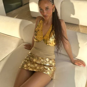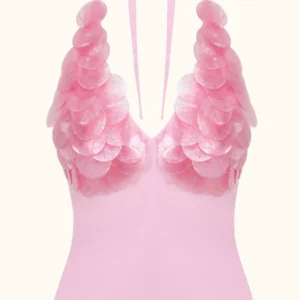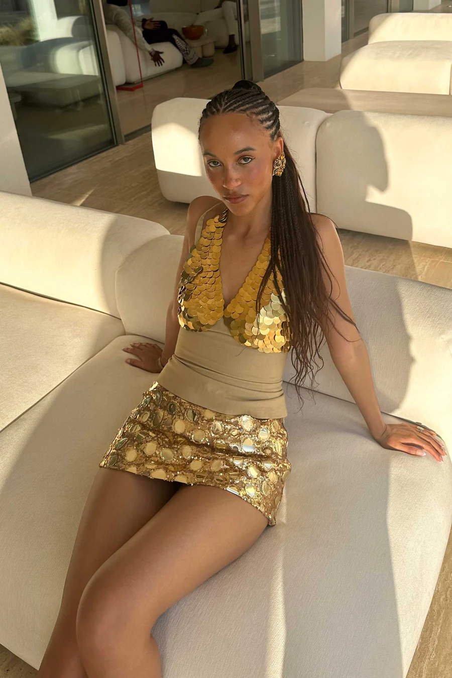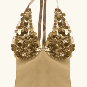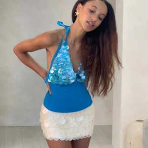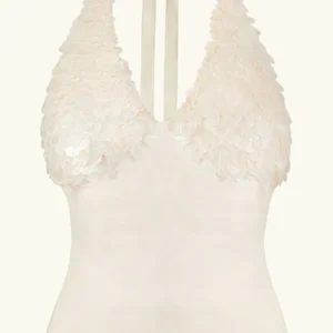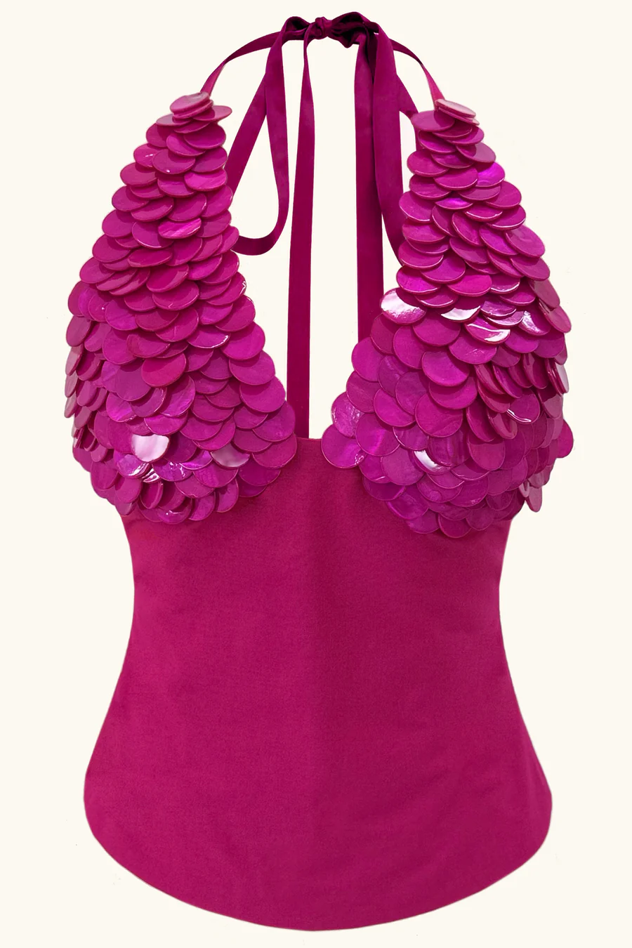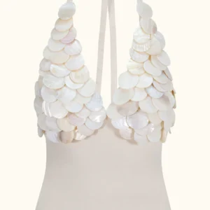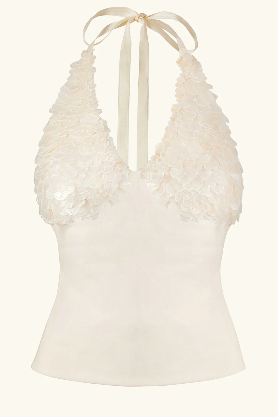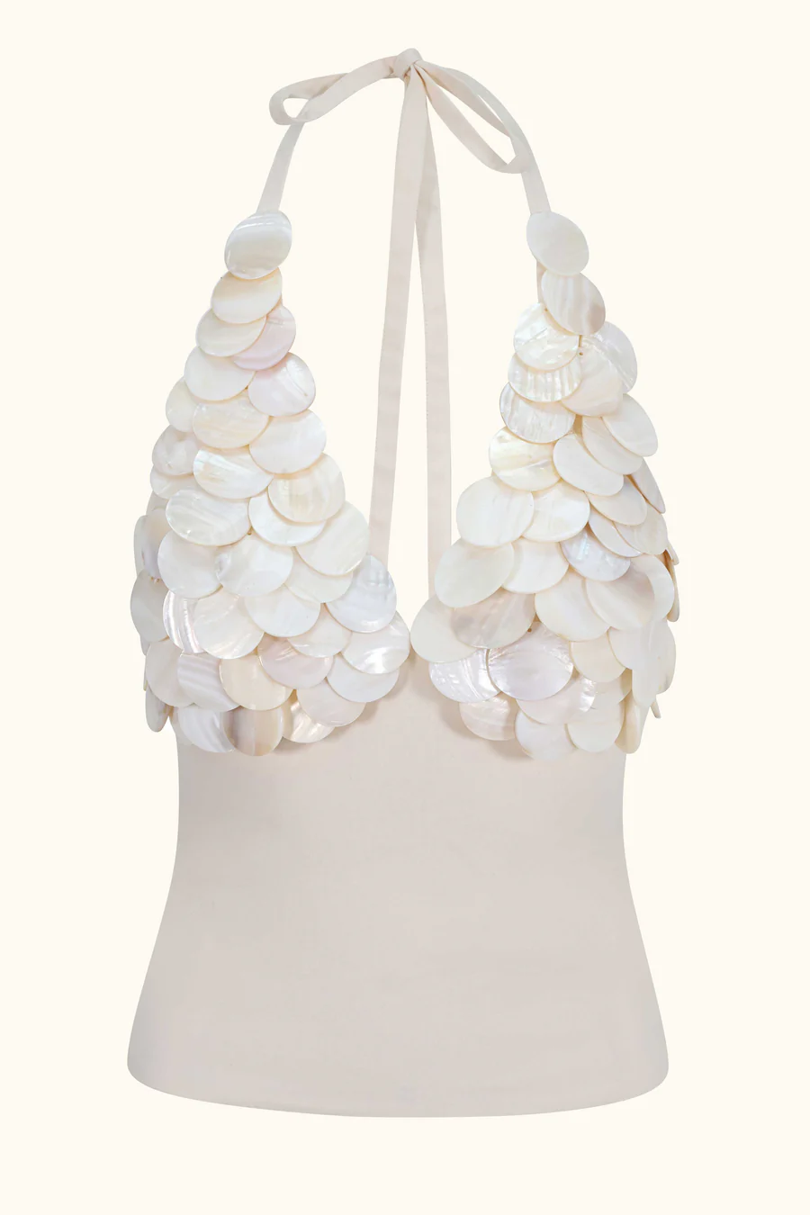 O top Siren é um modelo frente única com decote profundo, confeccionado em algodão cor marfim com amarração nas costas estilo corset e adornado com miçangas de conchas naturais bordadas à mão que cobrem todo o busto.