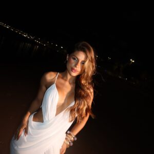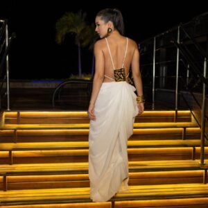 O tom off white reforça a proposta atemporal da peça, tornando-a perfeita para ocasiões especiais, produções noturnas à beira-mar, festas, eventos ao ar livre ou momentos em que o visual pede presença e delicadeza ao mesmo tempo.